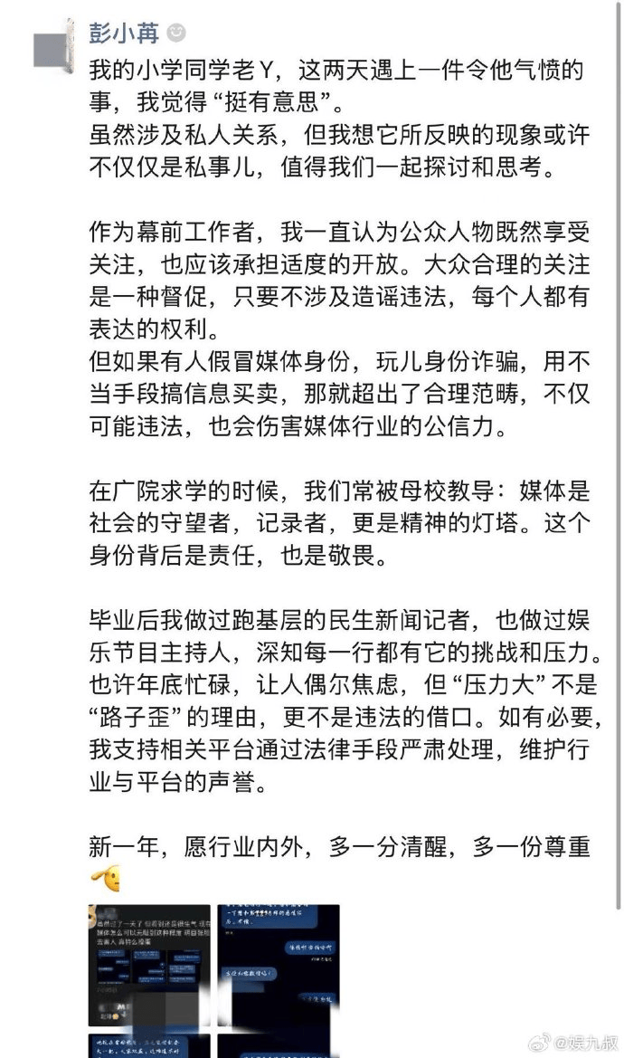 彭小苒发文强调,公众人物接受合理关注,但冒充媒体身份进行信息交易已涉嫌违法,不仅突破道德底线,更损害媒体公信力。她援引母校中国传媒大学/"媒体是社会的守望者/"的教导,呼吁行业尊重职业伦理,并表态支持通过法律手段维权。